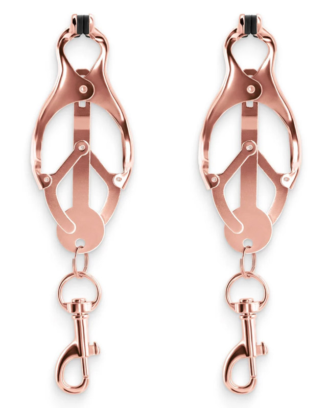 Bröstklämmor med kedja emellan. Kan skruvas åt till önskat tryck.