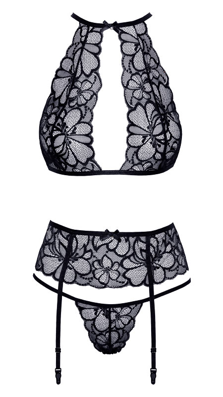 Sofistikerat och sensuellt underklädesset med BH, trosor och höfthållare. Storlek L-XL.